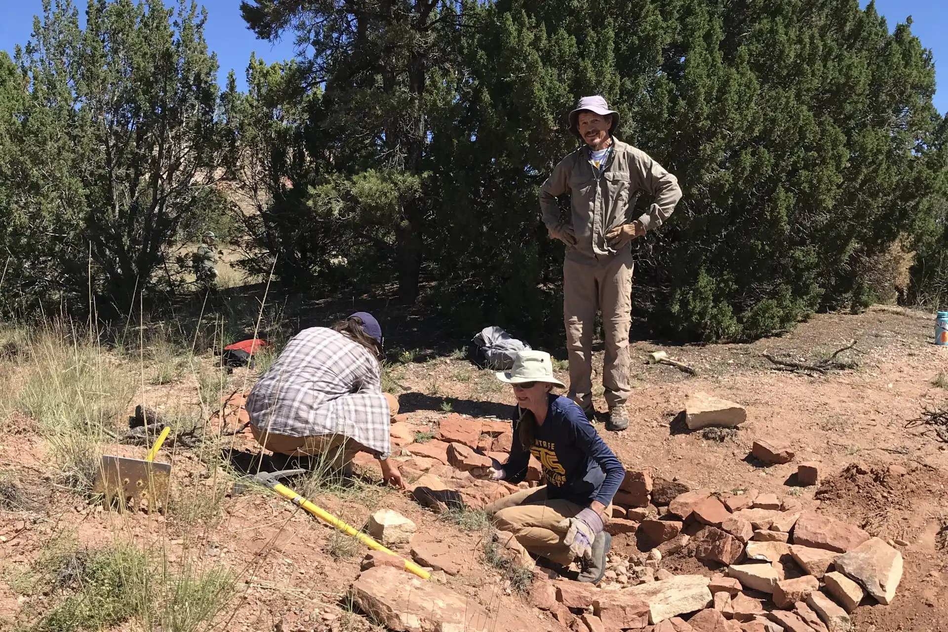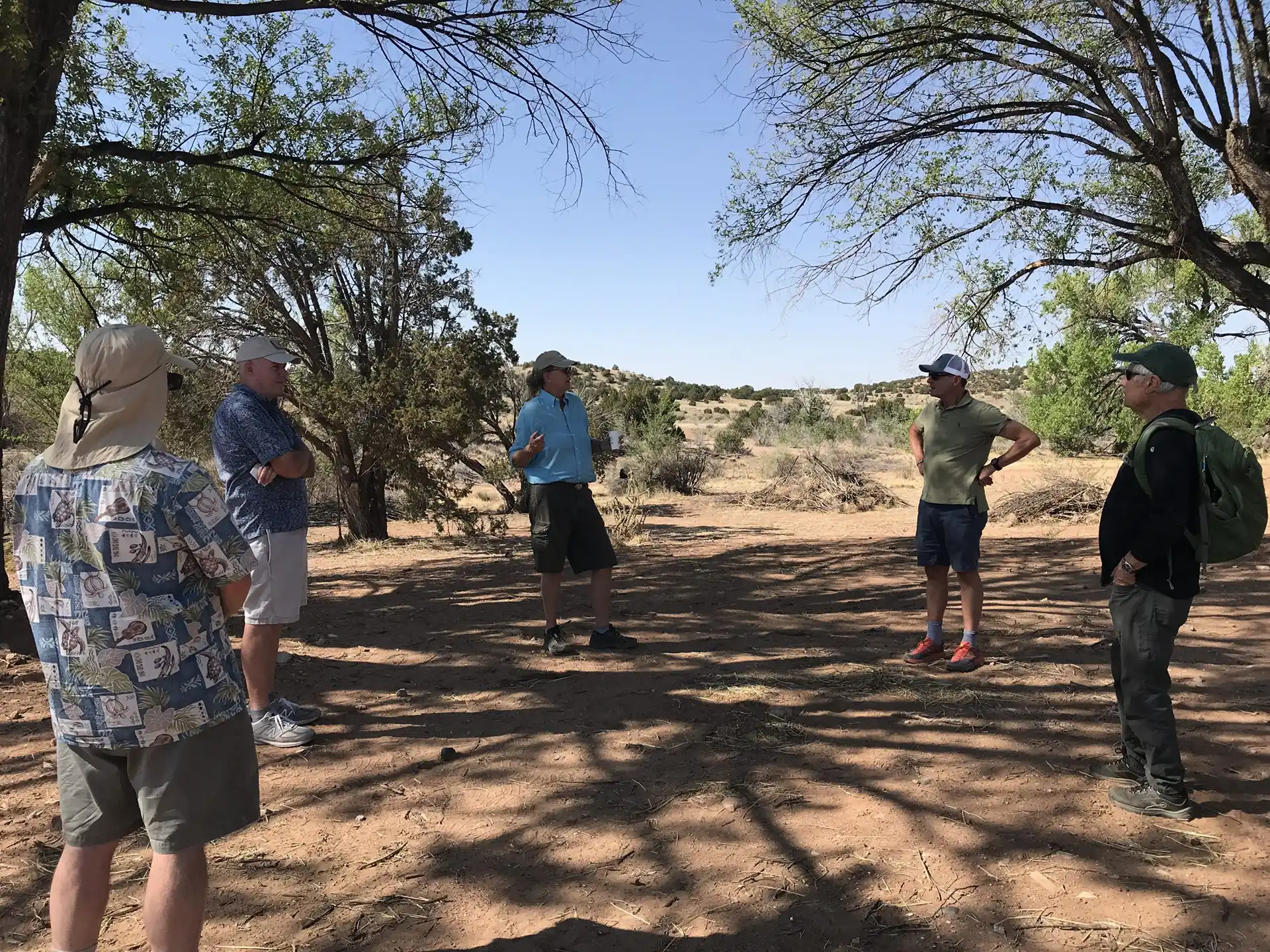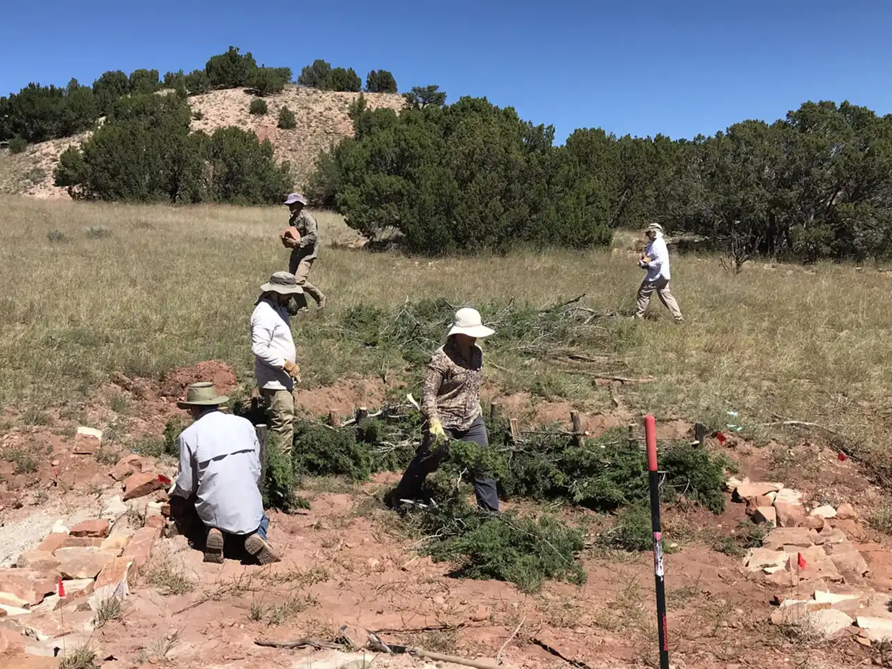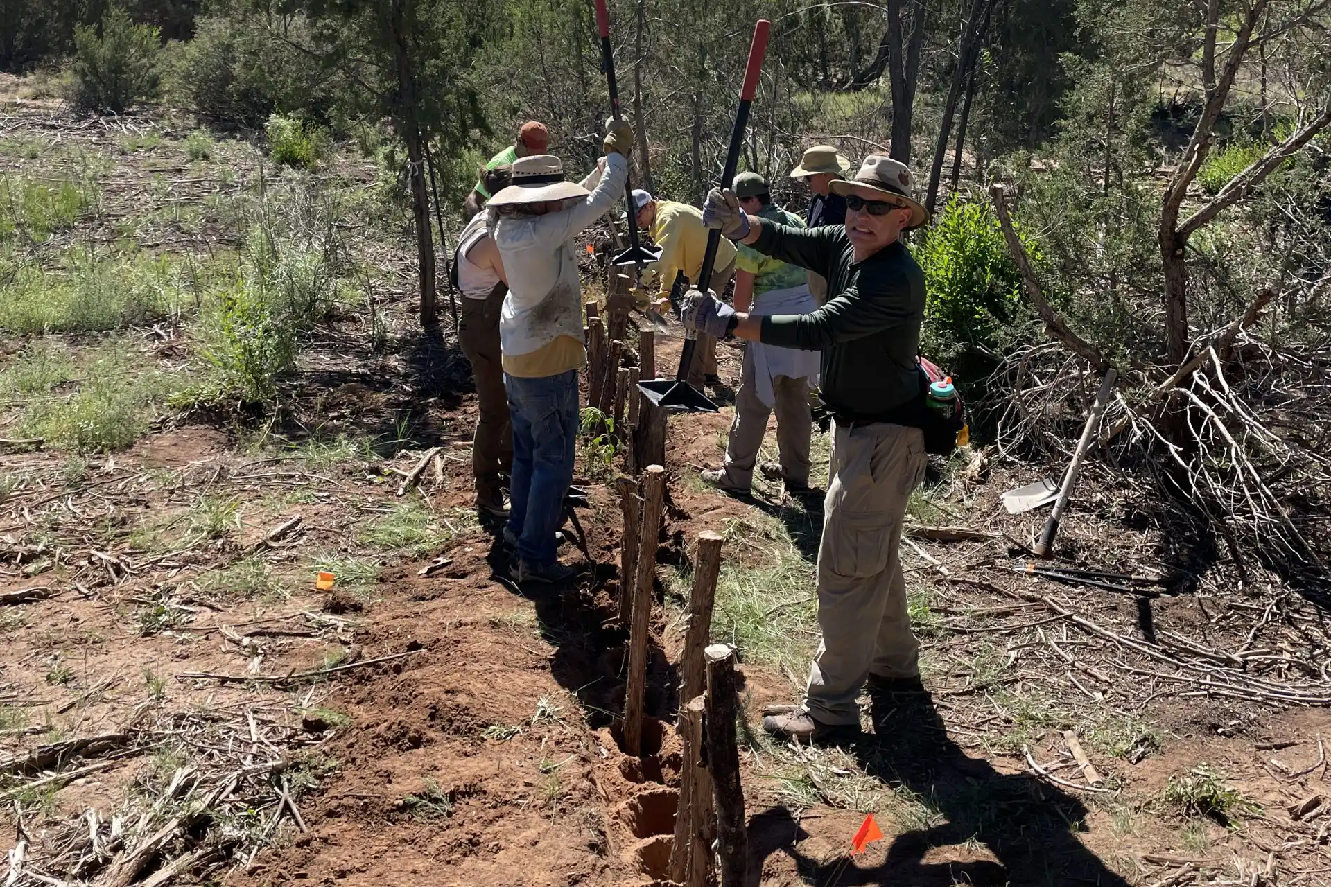Surrounded by almost 6,000 acres of contiguous SFCT conservation easements, the purchase of Dovetail is a huge leap forward in protecting the remnants of Native American habitation, telling the stories of the land, and plugging a potential development cluster. The Thaw Charitable Trust wanted to see the land return to a more natural state, so part of their support helped SFCT address the health of the land by reseeding the Headquarters area where buildings used to be to support habitat for wildlife and native/migratory birds. Because Dovetail’s piñon/juniper terrain is similar to that of many other landowners, workshops and workdays on erosion control techniques occurred in early 2021 through today to teach people how to mitigate erosion, slow runoff, and spread rainwater, healing the land. Swampers and sawyers have helped take out the invasive Siberian Elms and junipers in an overgrown ephemeral wetland. Subsequent workdays involved building wicker weirs to force water to meander through the wetland so it could deposit sediments and sink back into the aquifer.
