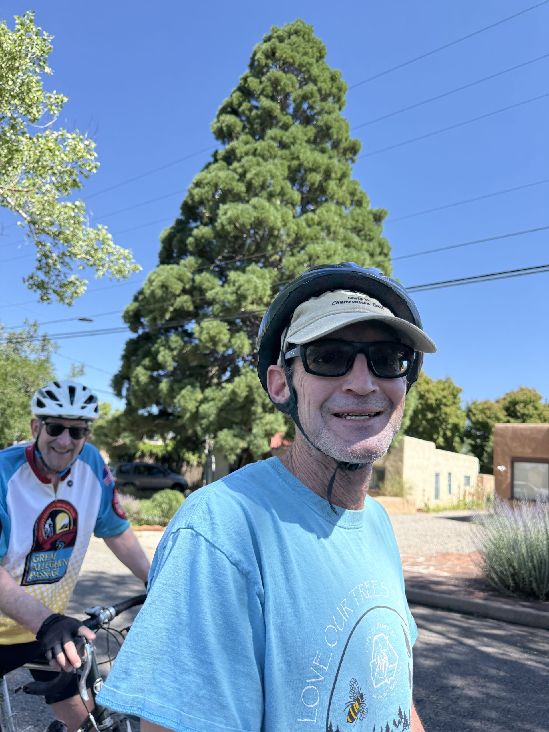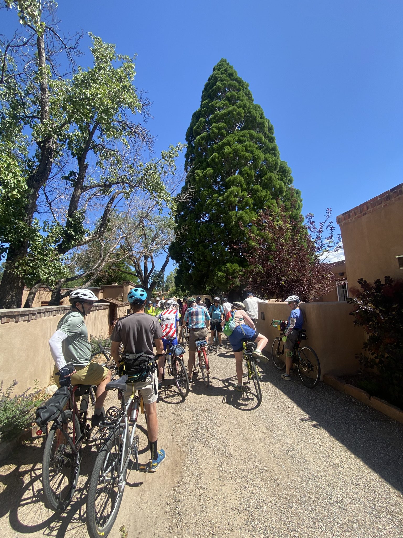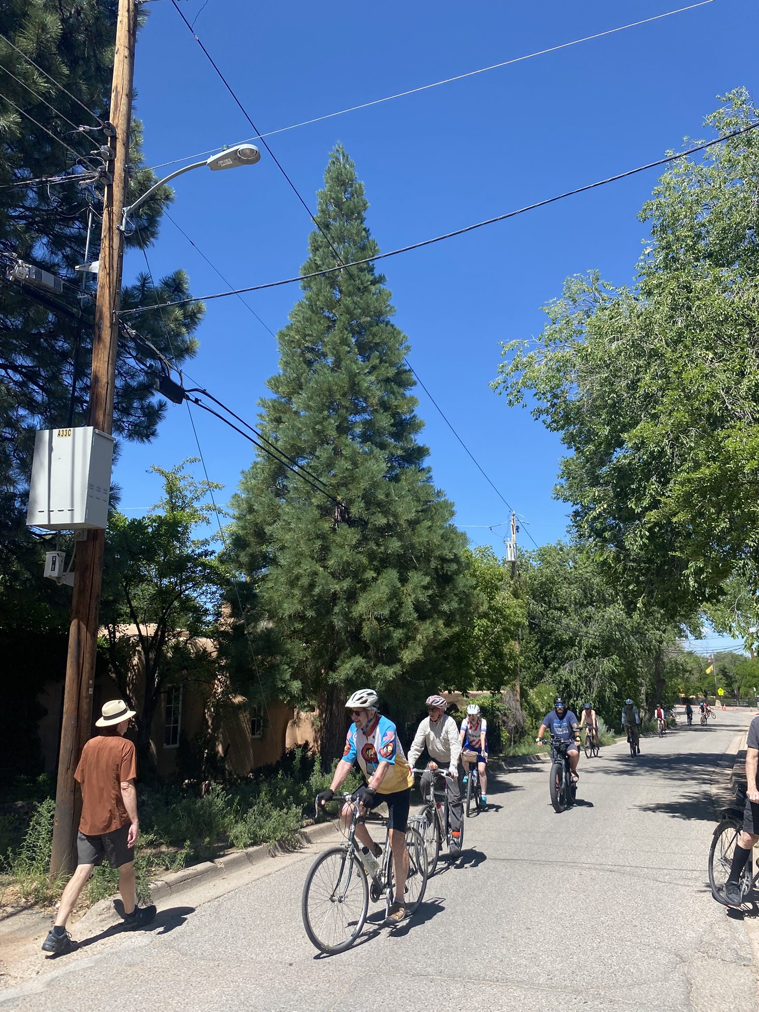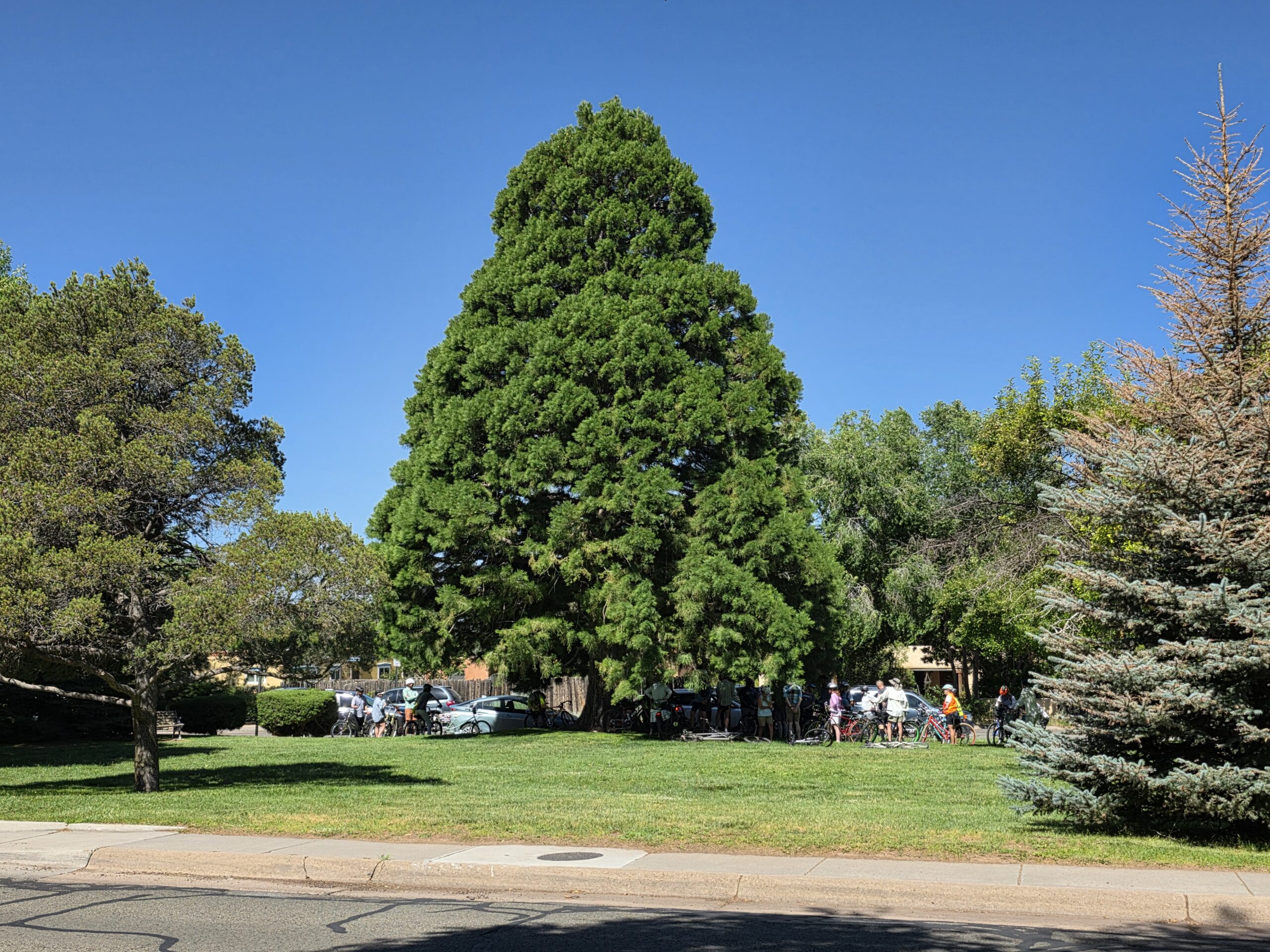 Over 45 riders joined the “Tour de Sequoia” on the morning of July 5, 2025 – one of the biggest “Commuity Cruises” ever! Special thanks to volunteers Maggie Odell, Yates Coulter, and Susan Coulter, who came up with the idea, researched and mapped the trees, helped determine the cycling route between them, and helped manage the considerable crowd of curious cyclists as we meandered around Santa Fe’s East Side, where these trees were planted back in the 1960s or so. All in all we visited 23 trees on this nearly three-hour tour. Four more that we know of were beyond the limits of this easy cruise and can be seen on the back of the pdf map linked below.