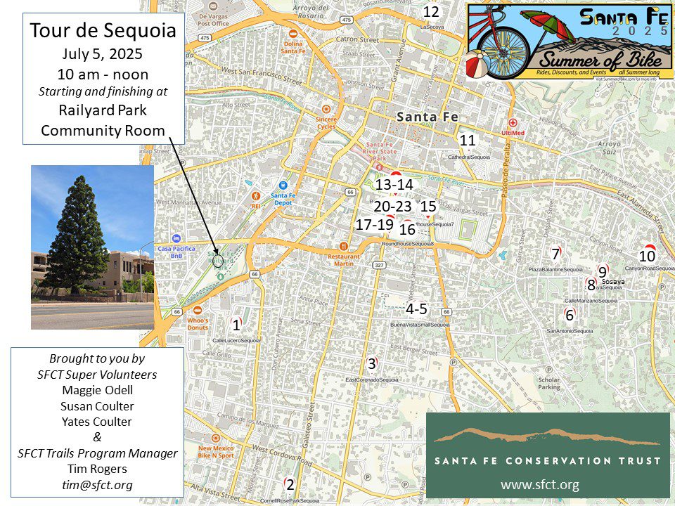 Pdf Link: Tour de Sequoia Map with Numbers, map above along with map of all known sequoias in the Santa Fe area on back. If you know of a local sequoia that is not on these maps, let us know!
